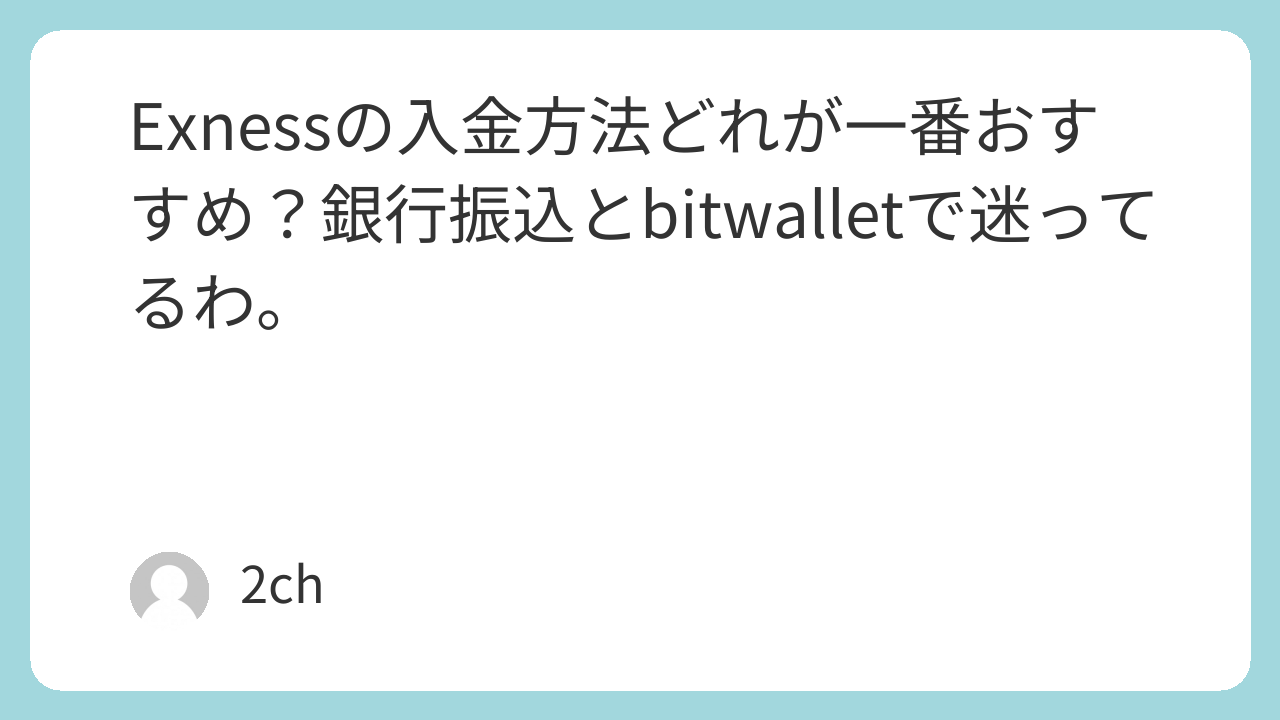 Exnessの入金方法どれが一番おすすめ?銀行振込とbitwalletで迷ってるわ。