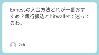 1 名前:TraderA 投稿日:2025/11/02(日) 02:50:12.34 ID:fx001Exnessの入金方法どれが一番おすすめ?銀行振込とbitwalletで迷ってるわ。2 名前:名無しさん 投稿日:2025/11/02(日...