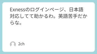 1 名前:TraderA 投稿日:2025/11/02(日) 02:10:15Exnessのログインページ、日本語対応してて助かるわ。英語苦手だからな。2 名前:FX初心者 投稿日:2025/11/02(日) 02:11:02スマホのブラウ...