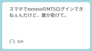 1 名前:名無しさん 投稿日:2025/11/02(日) 02:45:10スマホでexnessのMT5ログインできねぇんだけど、誰か助けて。2 名前:名無しさん 投稿日:2025/11/02(日) 02:45:25アプリは公式のMT5?それ...